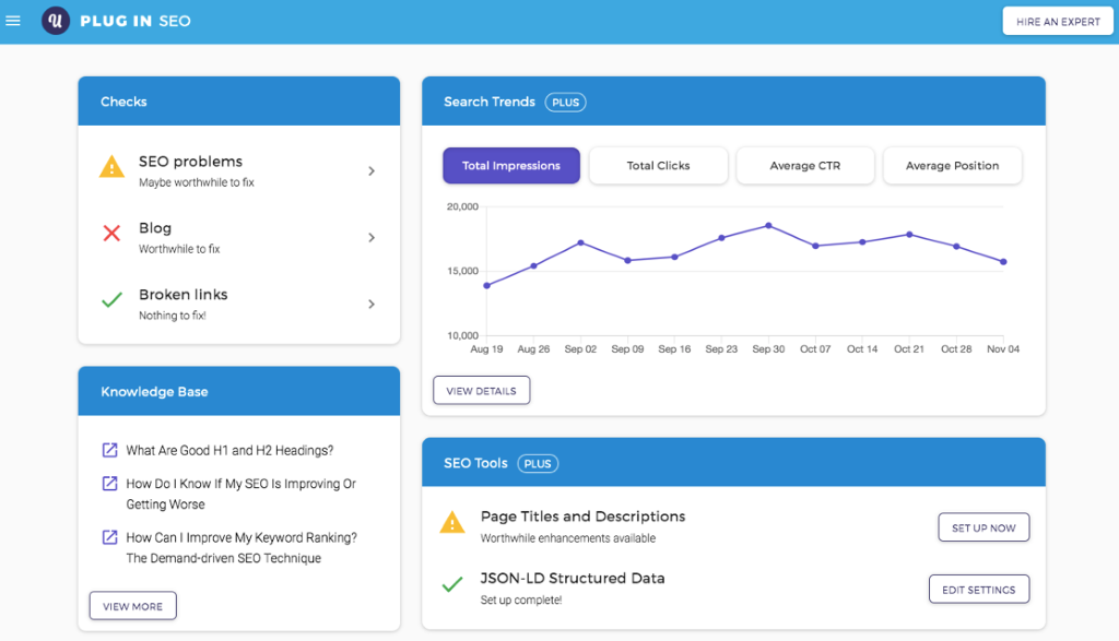 Aplikacja umożliwia tworzenie treści SEO: artykułów, opisów produktów z opcją analizy słów kluczowych. „Plug in SEO” umożliwia również kontrolę problemów z szybkością strony, udostępnia instrukcje dotyczące optymalizacji kodu, a w wersji płatnej dodatkowo wdrażanie aktualnych danych strukturalnych, jak np. News Article, SEO Breadcrumb list, Product.