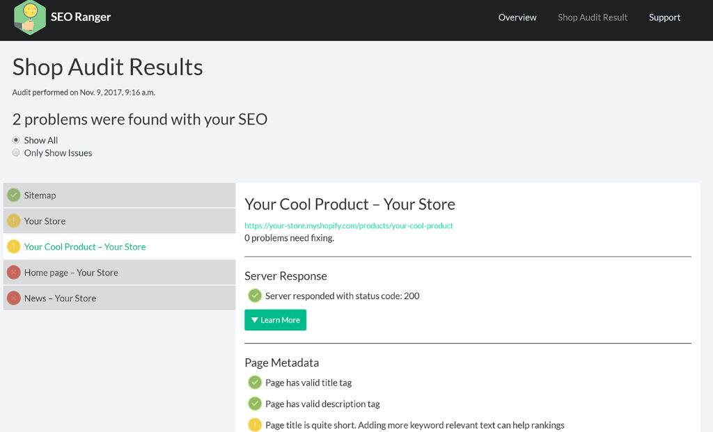 SEO Ranger to aplikacja, która umożliwia wykonanie analizy SEO. Po jednym kliknięciu SEO Ranger skanuje sklep w poszukiwaniu możliwości optymalizacyjnych. Skanowanie zajmuje kilka sekund – na koniec otrzymujemy raport z prostymi instrukcjami naprawy i optymalizacji poszczególnych elementów.
