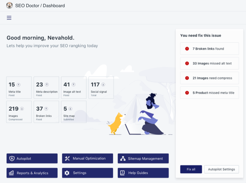 „Plug in SEO” jest jedną z najpopularniejszych aplikacji Shopify do poprawy SEO sklepów. Narzędzia używa ponad 30 000 sklepów Shopify. Dzięki aplikacji możemy wykonać szereg zmian, które pozytywnie wpłyną na pozycjonowanie sklepu: