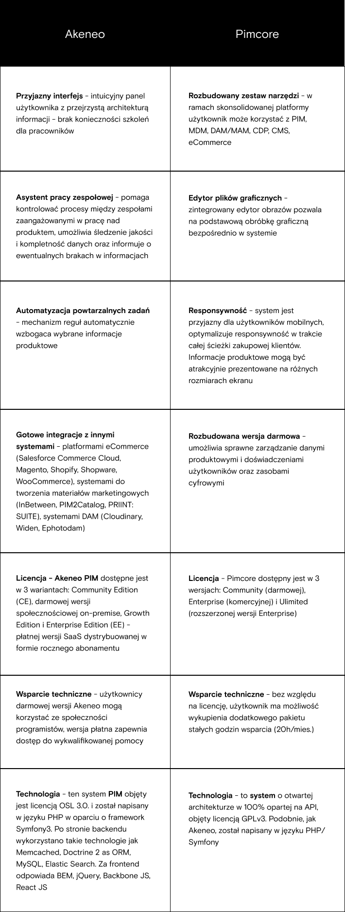Ze względu na technologię, Akeneo i Pimcore są do siebie podobne. Jak zatem wybrać system szyty na miarę Twojego przedsiębiorstwa? Akeneo to system kompletny i przejrzysty, posiadający szereg gotowych integracji, które rozszerzają funkcjonalności, które są dostępne w wersji OOTB. Oprogramowanie współgra z popularnymi platformami eCommerce, DAM i systemami do tworzenia materiałów marketingowych. Zaletą Pimcore jest z kolei szereg dodatkowych narzędzi, które pozytywnie wpływają na zarządzanie cyfrowymi doświadczeniami potencjalnych klientów. Warto jednak zaznaczyć, że liczba funkcjonalności sprawia, że korzystanie z Pimcore bywa skomplikowane, zwłaszcza na etapie wdrażania się w działanie systemu. To z kolei generuje potrzebę organizowania szkoleń dla pracowników, a co za tym idzie, wpływa na czas wdrożenia. Time to Market jest zdecydowanie dłuższy w przypadku tego systemu PIM. Akeneo jest rozwiązaniem wyposażonym w gotowy szablon produktowy, który można swobodnie rozszerzać według potrzeb. W przeciwieństwie do Akeneo Pimcore nie posiada również funkcjonalności, jaką jest automatyczne uzupełnianie brakujących danych za pośrednictwem tworzenia reguł produktowych. Aby ułatwić wybór, porównujemy oprogramowanie na poziomie najważniejszych czynników, do których zalicza się elastyczność, personalizacja, łatwość integracji i skalowalność: