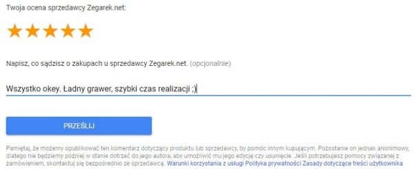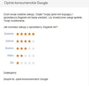 Po określonym czasie, na skrzynkę pocztową e-mail przychodzi ankieta do niewypełnienia, gdzie możemy ocenić zakup u sprzedawcy w skali od 1 do 5. W tej części oceniamy sprzedawcę oraz doświadczenia związane z zakupem.