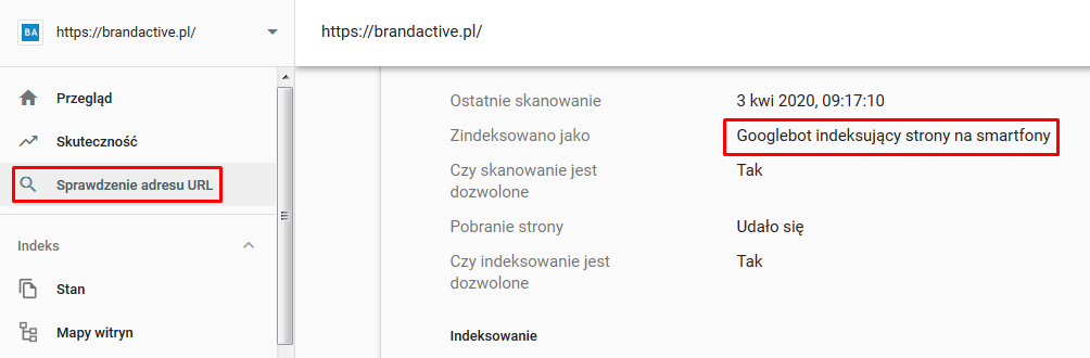 Indeksowanie witryny możemy również sprawdzić w opcjach ‘Sprawdzanie adresu URL’, gdzie możemy sprawdzić dany adres w kontekście jego ostatniego indeksowania: