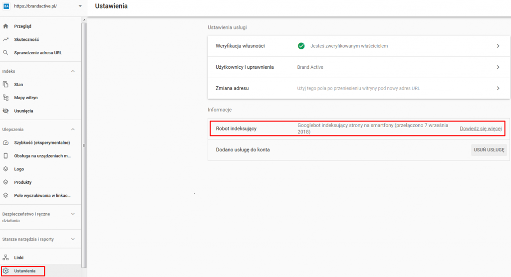 Obecnie mamy możliwość sprawdzenia indeksowania na urządzeniach mobilnych dla wszystkich stron w Google Search Console na kilka sposobów. Status witryny możemy określić w zakładce ‘Ustawienia’ (settings page):