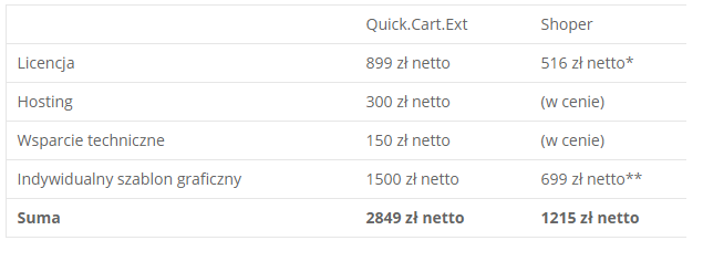 Quick.cart w podstawowej wersji jest darmowy, jest to jednak bardzo okrojona wersja, która nie zawiera wielu niezbędnych funkcji (jak np. płatności elektroniczne) i bardzo szybko może się okazać, że potrzeba zakupić wersję rozszerzoną, która kosztuje 890 zł netto (jednorazowo), zatem w dalszej części porównania weźmiemy pod uwagę wersję płatną Quick.Cart.Ext Quick.Cart.Ext to oprogramowanie, które samodzielnie instalujemy na własnym serwerze. Potrzebny jest zatem hosting spełniający określone wymagania stawiane przez sklep. Dedykowany hosting dla tego narzędzia, to wydatek ok. 300 zł netto rocznie. Instalację i konfigurację sklepu można przeprowadzić samodzielnie, jednak będąc laikiem w dziedzinie zagadnień sieciowych lub bez znajomości podstaw PHP można napotkać na przeszkody, tj. albo nie wszystko będzie działać jak należy (np. przekierowania, certyfikat bezpieczeństwa, zabezpieczenia itp.) albo coś nie będzie będzie działać w ogóle. Problemy pomoże rozwiązać pomoc techniczna wydawcy lub społeczność użytkowników systemu na forum (będzie Cię to kosztować czas), albo programista, który usługę z pewnością wyceni. Sklep już działa, jednak dostępne podstawowe szablony graficzne raczej nie spełnią Twoich oczekiwań, wyglądają jak sprzed 10 lat. Twój sklep nie wzbudza zaufania i daleko mu do konkurencji. Jest na to rada, można skorzystać z usług firm oferujących zaprojektowanie i wdrożenie grafiki pod indywidualne wymagania klienta. Ile to kosztuje? Nie ma górnej granicy, jednak za dolną warto przyjąć kwotę min. 1500 zł netto, a i to może okazać się niewystarczające, by stworzyć projekt nadążający za obecnymi trendami. Zatem masz już działający sklep z fajną grafiką, ale co będzie, gdy pojawią się problemy techniczne, których rozwiązanie przekracza Twoje możliwości, np. niedziałające wtyczki, błędnie wyświetlające się elementy graficzne, problemy z instalacją i konfiguracją dodatków, komunikaty o błędach? Uporanie się z tym wymaga wsparcia technicznego, które w rozliczeniu abonamentowym będzie Cię kosztować (w zależności od potrzeb) min.150 zł miesięcznie lub będzie rozliczane za usługę, co prawdopodobnie wygeneruje dużo większe koszty. Jak szybko Twoja pomoc techniczna zareaguje i rozwiąże problem? Zupełnie inaczej to wygląda w przypadku Shopera. System ten działa w modelu SaaS, to znaczy, że płacisz za dostęp do w pełni funkcjonalnej usługi. Instalacja, zabezpieczenia, hosting, wdrożenia nowych funkcjonalności, aktualizacje i backupy nie zaprzątają Ci głowy, ponieważ wszystko to jest wliczone w cenę miesięcznego abonamentu i nie wymaga Twojej ingerencji. Najtańszy abonament kosztuje 72 zł netto mies. (864 zł netto rocznie). Podobnie jak w przypadku Quick.Cart warto jednak skorzystać z trochę droższej wersji, zawierającej przydatne dodatki. Cena pakietu Platynowego to 108 zł netto mies. (1296 zł netto rocznie). Na szczęście łatwo trafić na promocję, w której pierwszy rok korzystania ze sklepu będzie tańszy niemal o 70%. W Shoperze otrzymujemy podstawowy, responsywny szablon graficzny, który jest bardzo dobrze zaprojektowany pod względem użyteczności (klienci nie będą mieć problemów z dokonaniem zakupu w Twoim sklepie) jednak jest on zaprojektowany w sposób minimalistyczny, tj. ilość elementów graficznych jest ograniczona do minimum. Dostępne są jednak płatne szablony RWD w cenie 399 zł netto, różniące się między sobą układem i zawartością grafiki. Po zakupie takiego szablonu należy przygotować własny zestaw bannerów. Można pokusić się o samodzielne ich przygotowanie (za pomocą internetowych narzędzi do edycji grafiki) lub zlecić grafikowi, co może kosztować np. 300 zł. Podmiana bannerów jest łatwa i odbywa się za pomocą kilku kliknięć w panelu administracyjnym.