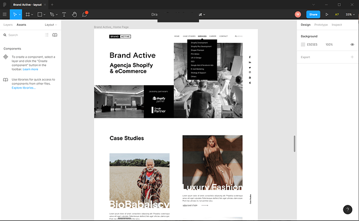 Całość prac została wykonana w aplikacji do projektowania interfejsów - Figma. To narzędzie, które jest cenione nie tylko wśród projektantów, ale również pośród deweloperów. Zapewnia wszystkie narzędzia potrzebne na etapie projektowania, w tym narzędzia wektorowe, które są zdolne do pełnoprawnego tworzenia ilustracji, a także możliwości prototypowania i generowania kodu do przekazania. Figma jest dostępna zarówno na przeglądarce, jak i w formie aplikacji dla systemu Windows oraz Mac OS. Ponadto pozwoliła na współpracę kilku osób nad projektem nowego layoutu Brand Active w czasie rzeczywistym, dzięki czemu każda osoba z zespołu była na bieżąco zsynchronizowana z projektem, a praca nad wdrożeniem była płynna oraz przebiegała w szybkim, zadowalającym tempie.