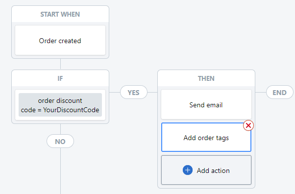 Współpracujesz z różnymi grupami odbiorców, dla których konieczna jest weryfikacja przysługujących im zniżek? Z wykorzystaniem Shopify Flow to nie problem. Załóżmy, że odbiorcami Twoich produktów są szkoły, które biorą udział w akcji X, dzięki czemu mogą liczyć na 50% zniżkę. Jak uniknąć sytuacji wykorzystania kodu rabatowego przez nieodpowiednie osoby? Z wykorzystaniem Shopify Flow możemy śledzić każde zamówienie, w którym wykorzystany został określony kod rabatowy. Automatyzacja po zarejestrowaniu zamówienia, w którym użytko dany kod rabatowy wyśle powiadomienie do określonej osoby z Twojego zespołu i poprosi o jego weryfikację. Do zamówienia może dodać się również określony tag, byś bez problemu mógł filtrować zamówienia według interesujących Cię danych.