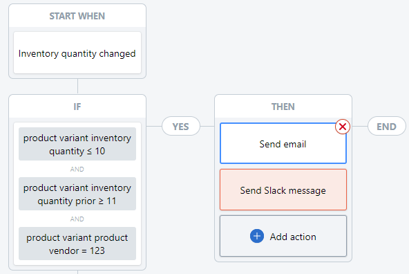 Problem z dostępnością Twoich produktów może zostać sprawnie rozwiązany. Ta automatyzacja pozwala śledzić stany magazynowe produktów i uruchamiać określone akcje po spełnieniu danych warunków. Załóżmy, że produkty producenta “123”, które sprzedajesz w swoim sklepie, mocno zyskały na popularności i zaczęły się wyprzedawać. By uniknąć całkowitego wyprzedania się, automatyzacja powiadomi Cię, lub wskazaną przez Ciebie osobę, poprzez email lub Slack o osiągnięciu wyznaczonego stanu magazynowego na Twoim sklepie, np. mniej niż 10 sztuk. Flow może również od razu zainicjować nowe zamówienie u Twojego dostawcy, poprzez wysłanie do niego określonego maila z prośbą o zamówienie kolejnej partii produktów.
