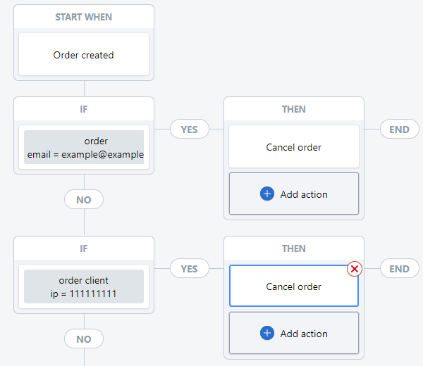 Zdarza Ci się realizować zamówienia, które w większości przypadków wracają do Ciebie? Każdy sklep mierzy się z tym problemem. Jak możemy to ograniczyć z wykorzystaniem Shopify Flow? Shopify daje nam możliwość automatycznego określania ryzyka realizacji zamówienia. Przy wysokim ryzyku możemy ustawić regułę, która anuluje dane zamówienie. Możemy również robić to, określając konkretne adresy email, na które złożone zostało zamówienie lub IP użytkownika. W przypadku, gdy widzimy, że dany adres email składa tylko zamówienia i nigdy nie dochodzą one do realizacji, dzięki Shopify Flow możemy uruchomić regułę, która automatycznie anuluje takie zamówienie, wyśle email do klienta oraz zwróci zamówione produkty na magazyn. Wówczas zamówienia z wysokim ryzykiem obsługiwane są praktycznie bez naszego udziału, nie zabierając nam naszego cennego czasu.