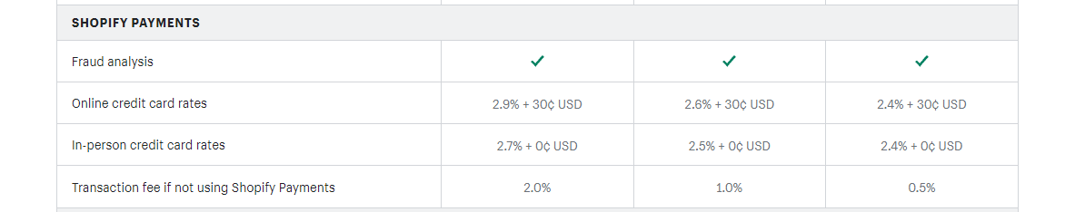 - Shopify payments (wysokość stawki, im wyższy plan, tym niższa stawka prowizji do zapłacenia)